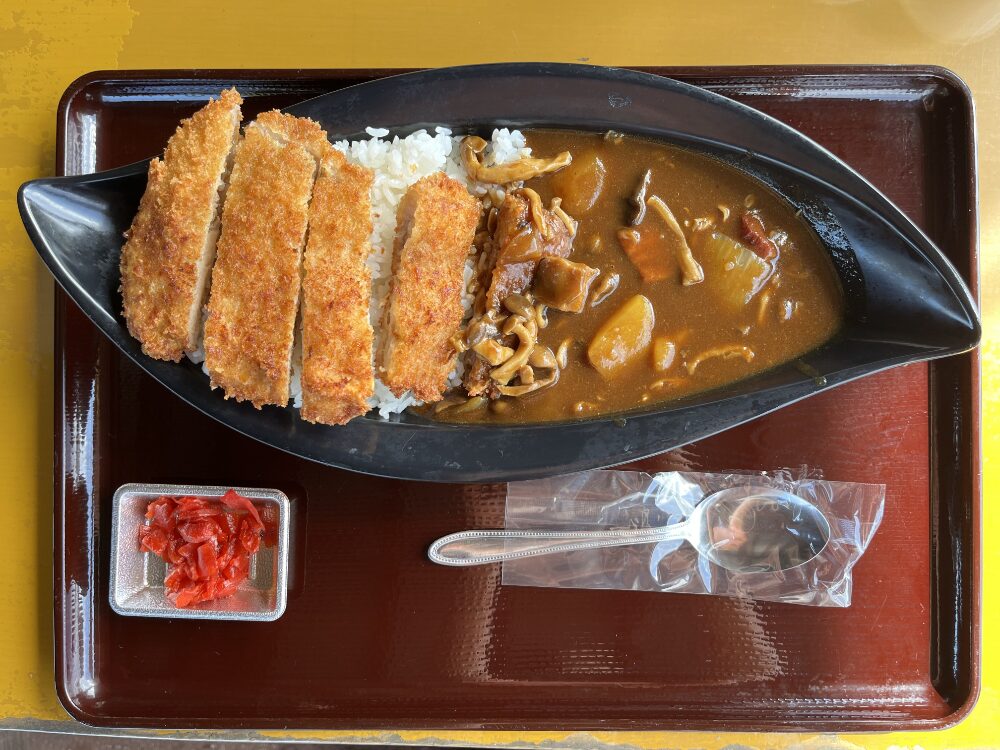 王道のカレーに、サクサクのカツときのこがたっぷり。ルーの中にはサイコロ状のお肉がゴロゴロ入っていて食べ応え抜群!