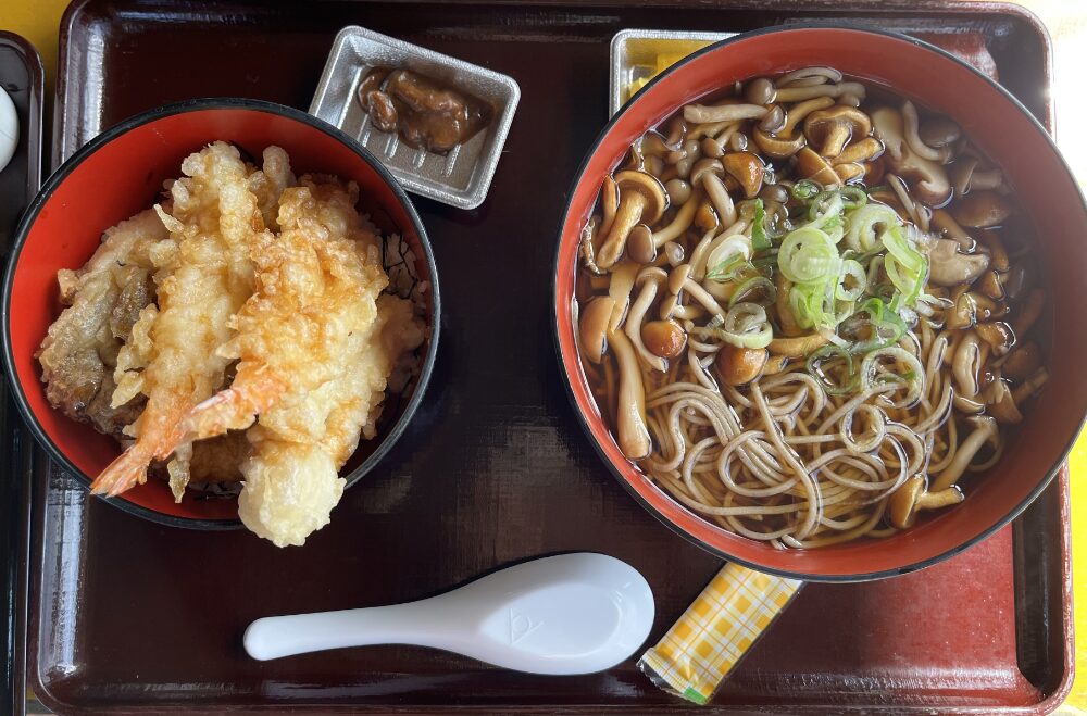 さっぱりした喉ごしの良いそばに、衣が厚めのきのこの天ぷらが相性抜群。天ぷらをつけ汁にくぐらせて食べたりと、自分好みにカスタマイズできるのが楽しい!