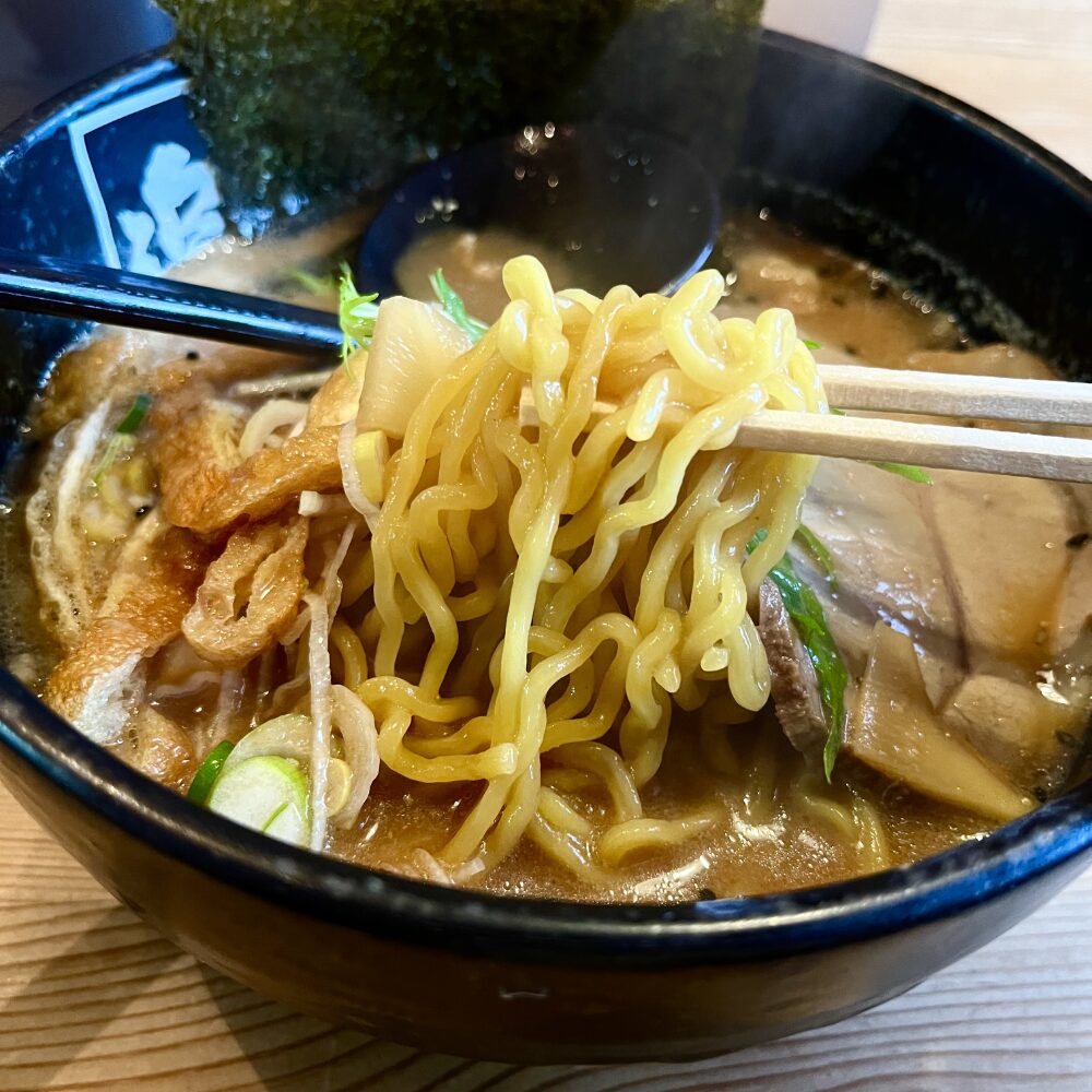 いわゆる純すみ系ラーメンと比較すると、こってり味噌ラーメンよりは軽め。なので、