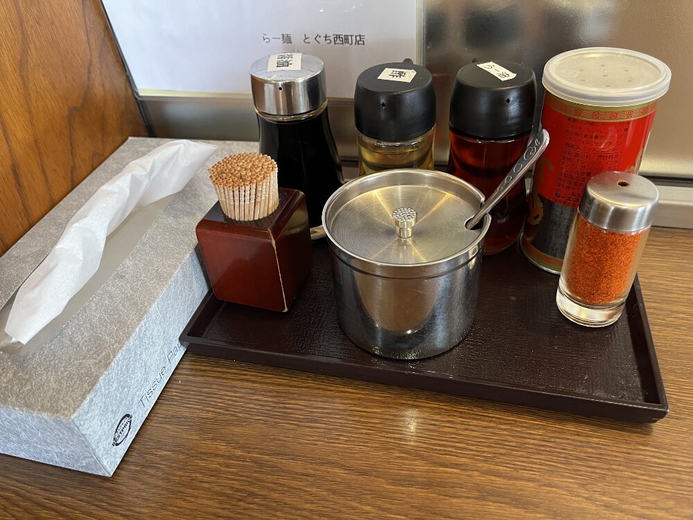 さらに、卓上にはにんにく、ラー油、一味、酢、塩胡椒など調味料が豊富に用意されています。途中で味変しながら食べ進めるのもおすすめ。自分好みにカスタマイズできるので、最後まで美味しく完食できました。